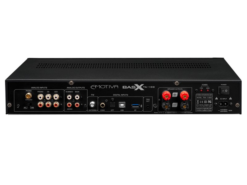 Emotiva BasX TA-100 сочетает функции и возможности стереофонического предусилителя ультимативного качества, высокопроизводительного FM-тюнера и высококачественного усилителя мощности — все в одном удобном корпусе. Секция предусилителя включает аналоговые входы линейного уровня для проигрывателя компакт-дисков или линейного источника, встроенный USB-ЦАП с большим количеством цифровых входов для компьютера и других источников цифрового стереозвука, высококачественный предусилитель-корректор проигрывателя виниловых дисков, который поддерживает картриджи как с подвижным магнитом, так и с подвижной катушкой, а также технические средства для дополнительного приемника высококачественного аудиосигнала пл протоколу AptX Bluetooth. Тюнер предлагает полное цифровое управление и 50 предустановленных станций. Полностью дискретная секция инвертирующего усилителя класса A/B обеспечивает достаточную чистую мощность для работы двух высококачественных стереофонических акустических систем на требуемом уровне громкости; TA-100 имеет также линейные выходы для активного сабвуфера или для подключения внешнего усилителя мощности. Управление TA-100 производится с помощью простых элементов на лицевой панели или с помощью входящего в комплект инфракрасного пульта дистанционного управления. Интуитивно понятная система меню упрощает настройку и эксплуатацию TA-100, а крупный и легко читаемый ВЛД-дисплей на лицевой панели устройства в постоянном режиме показывает, что именно происходит в данный момент времени.